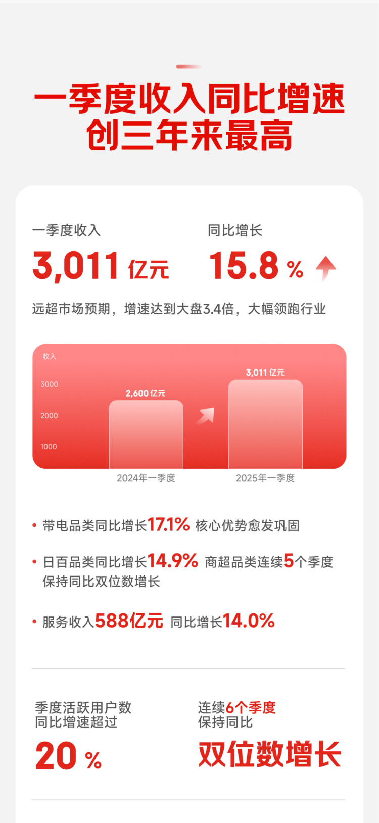 一季度,京东集团收入为3,011亿元人民币(约415亿美元),同比增长15.8%,远超市场预期,在保持加速增长的同时也创下近三年来的最高同比增速,达到同期大盘增速的3.4倍并领跑行业。