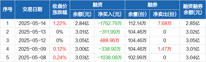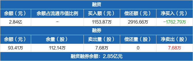融资方面,当日融资买入1153.87万元,融资偿还2916.66万元,融资净偿还1762.79万元。融券方面,融券卖出7.68万份,融券偿还0份,融券余量112.14万份,融券余额93.41万元。融资融券余额合计2.85亿元。