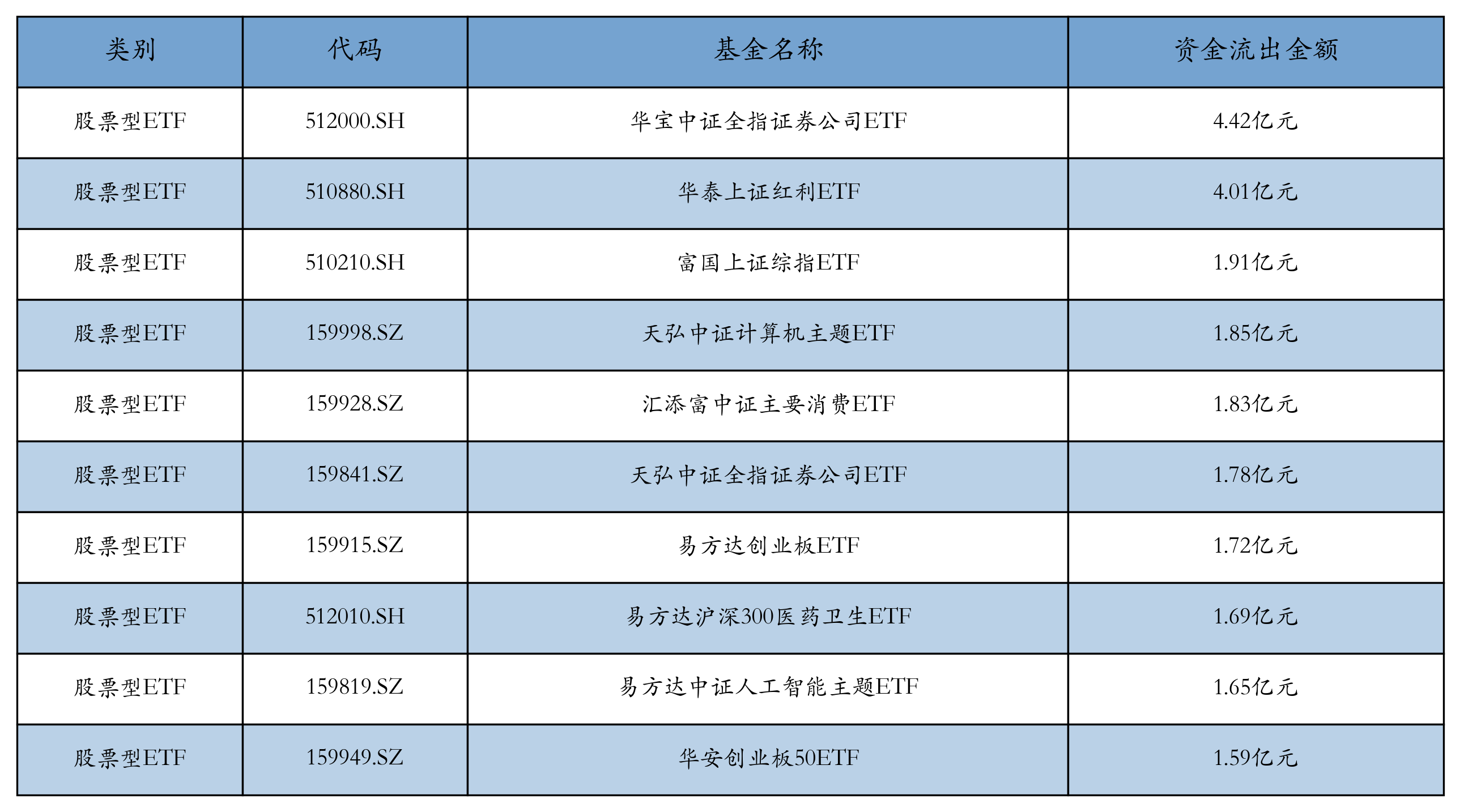 昨日股票型ETF资金流出最多的3支ETF及其流出金额分别为:华宝中证全指证券公司ETF(流出4.42亿元)、华泰上证红利ETF(流出4.01亿元)、富国上证综指ETF(流出1.91亿元)。资金流出前10详情见下表: