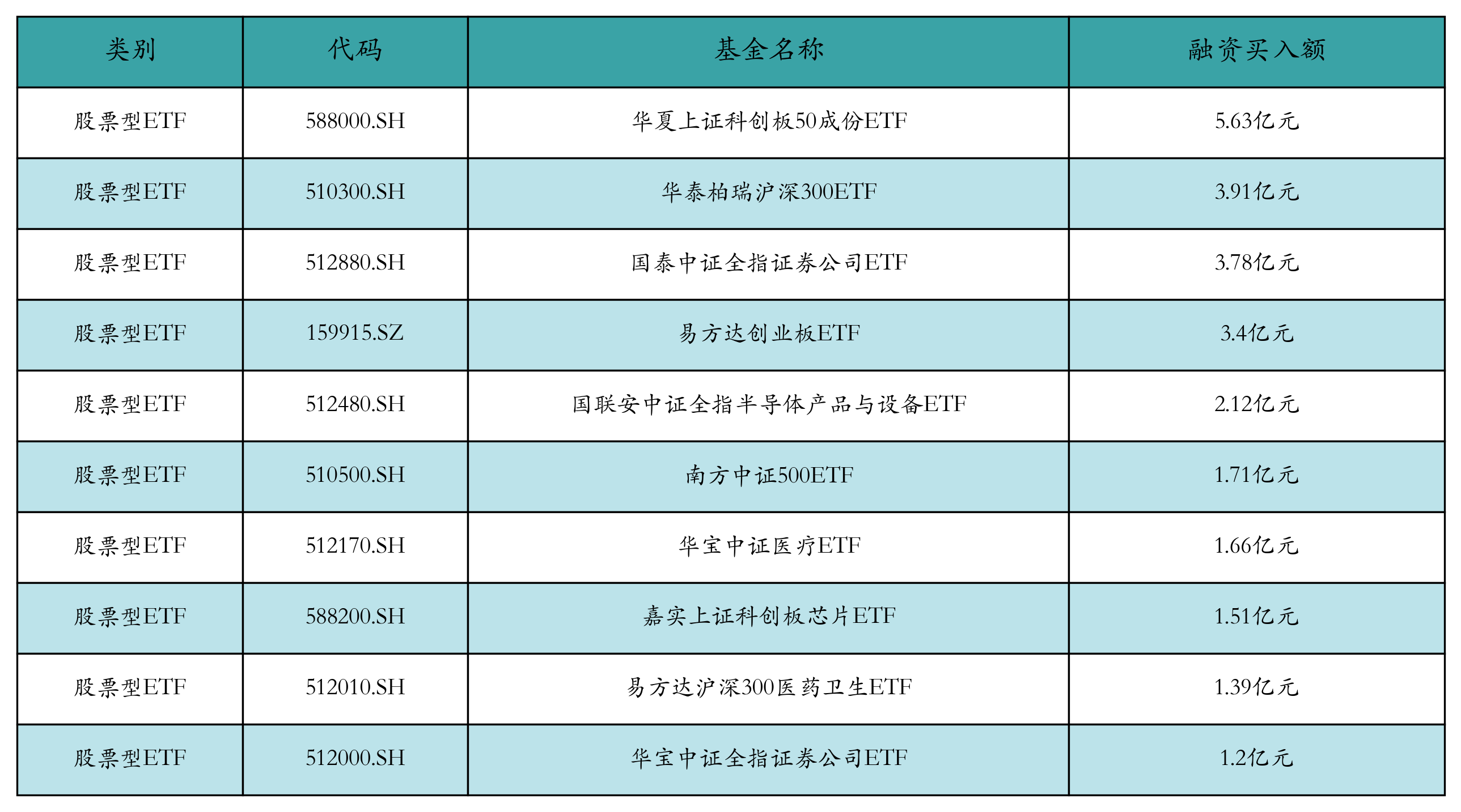 昨日股票型ETF融资买入额最高的3支ETF及其买入金额分别为:华夏上证科创板50成份ETF(5.63亿元)、华泰柏瑞沪深300ETF(3.91亿元)、国泰中证全指证券公司ETF(3.78亿元)。融资买入额前10详情见下表: