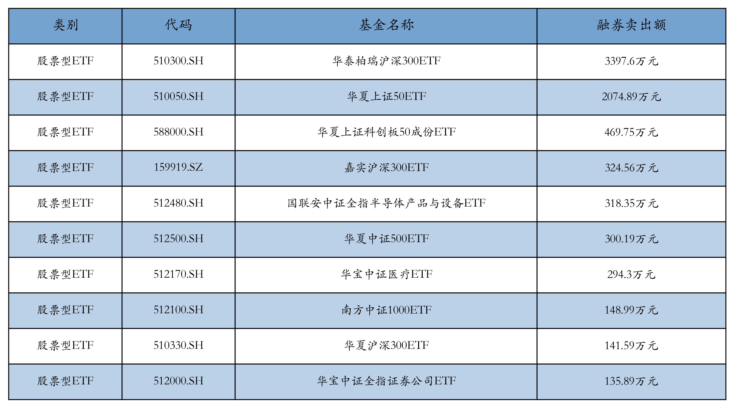 昨日股票型ETF融资卖出额最高的3支ETF及其卖出金额分别为:华泰柏瑞沪深300ETF(3397.6万元)、华夏上证50ETF(2074.89万元)、华夏上证科创板50成份ETF(469.75万元)。融券卖出额前10详情见下表:
