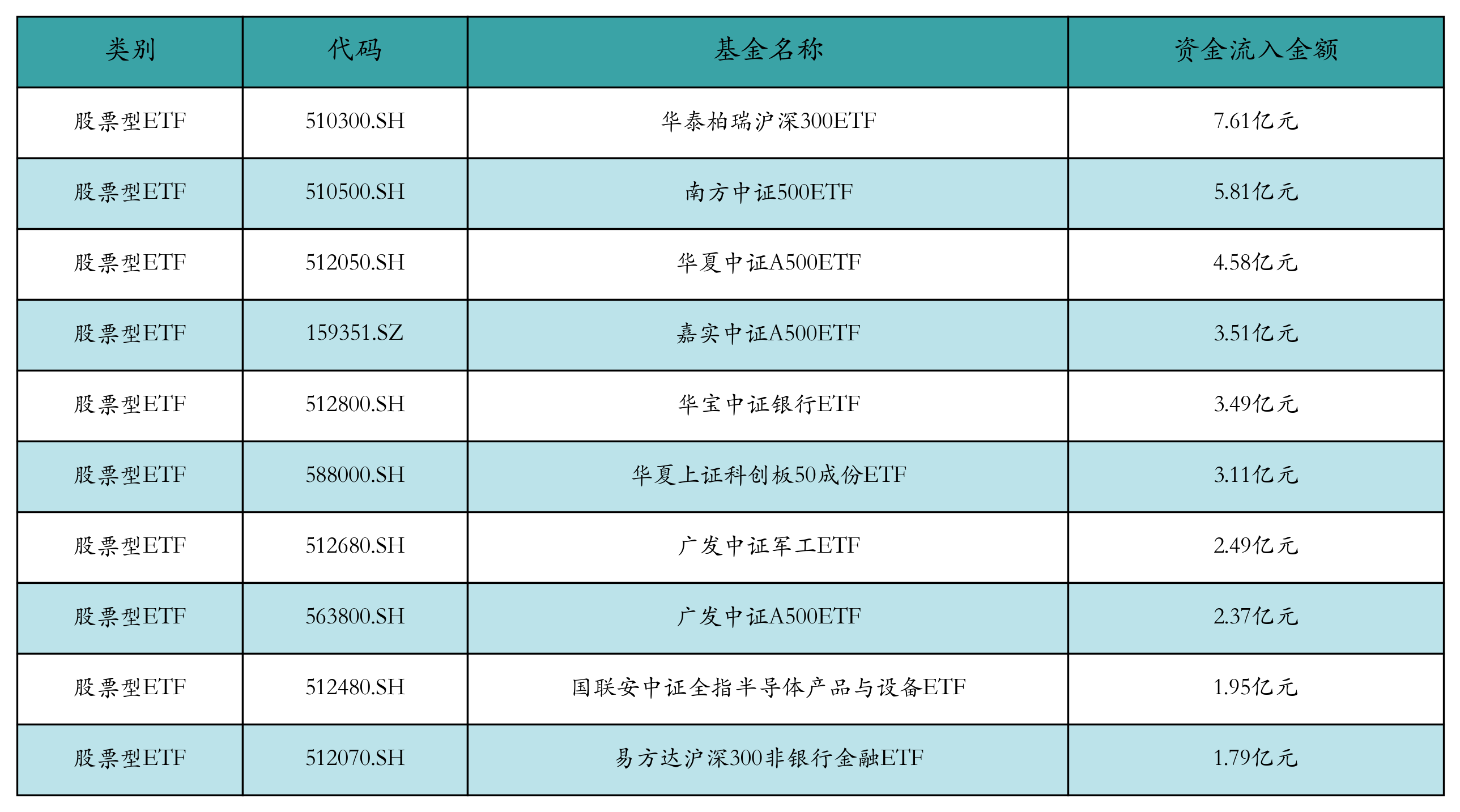 昨日股票型ETF资金流入最多的3支ETF及其流入金额分别为:华泰柏瑞沪深300ETF(流入7.61亿元)、南方中证500ETF(流入5.81亿元)、华夏中证A500ETF(流入4.58亿元)。资金流入前10详情见下表: