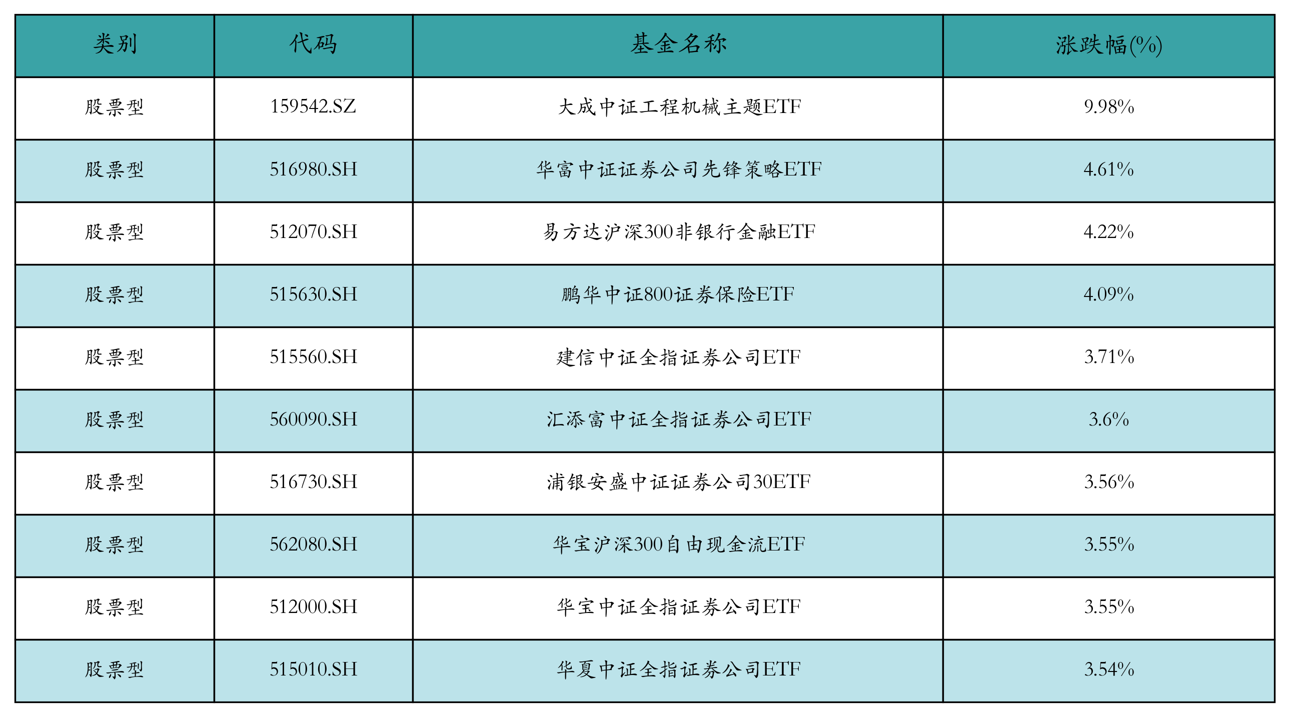 昨日股票型ETF涨幅最高的3支ETF及其收益率分别为:大成中证工程机械主题ETF(9.98%)、华富中证证券公司先锋策略ETF(4.61%)、易方达沪深300非银行金融ETF(4.22%)。涨幅前10详情见下表: