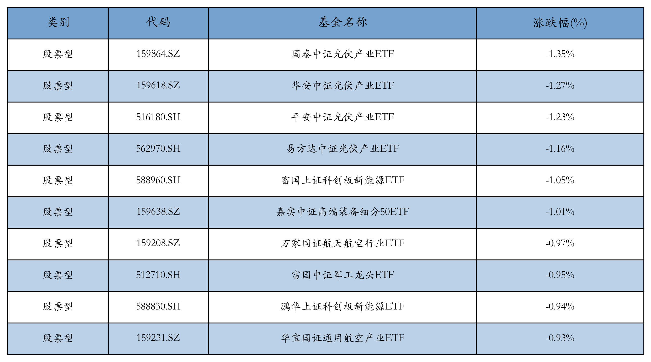 昨日股票型ETF跌幅最大的3支ETF及其收益率分别为:国泰中证光伏产业ETF(-1.35%)、华安中证光伏产业ETF(-1.27%)、平安中证光伏产业ETF(-1.23%)。跌幅前10详情见下表: