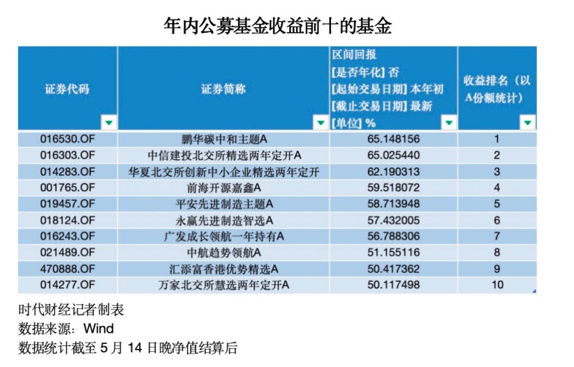 从年内收益靠前的十只公募基金产品来看,北交所主题基金有3只进榜,“先进制造”、“成长”、“香港”也是收益关键词。