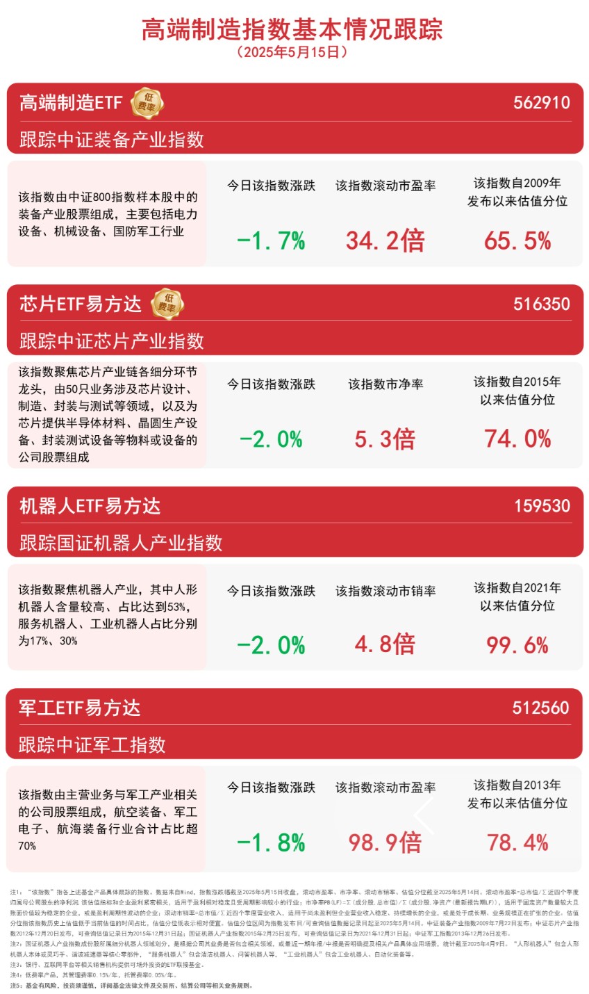 截至收盘,中证装备产业指数下跌1.7%,中证芯片产业指数、国证机器人产业指数均下跌2.0%,中证军工指数下跌1.8%。