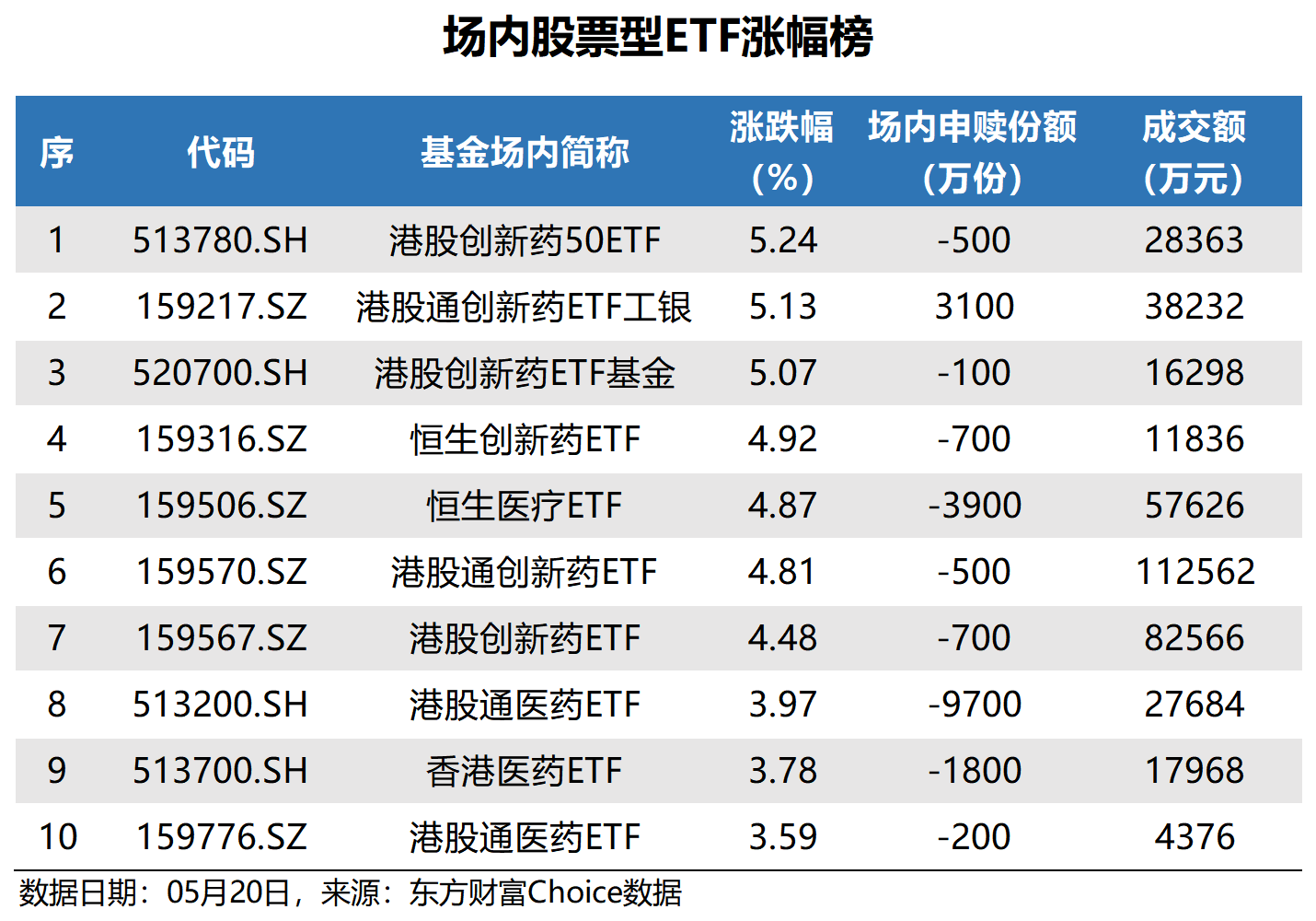 数据显示,昨日场内股票型ETF中,港股创新药50ETF、港股通创新药ETF工银、港股创新药ETF基金涨幅居前。其中,港股创新药50ETF涨幅最大,为5.24%。