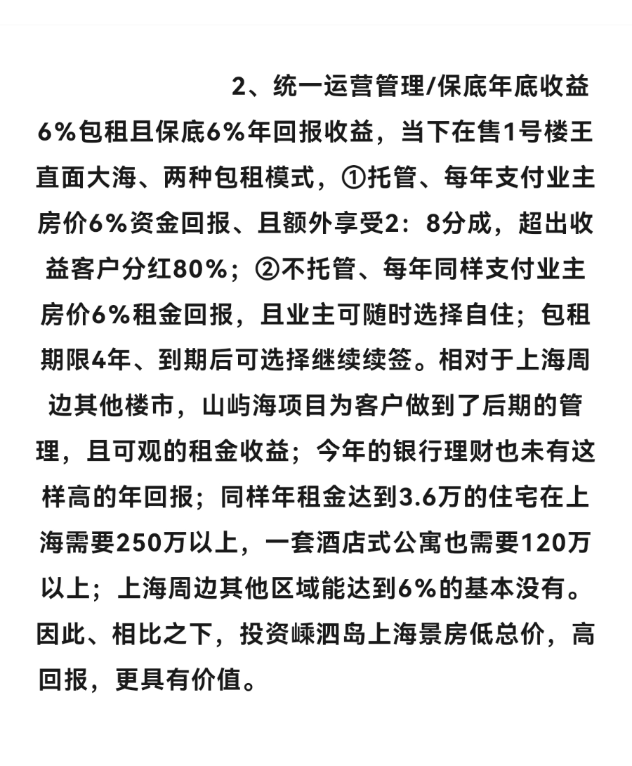 值得关注的是,山屿海还涉及房产投资。有过往的广告资料宣传称,“舟山嵊泗岛海景房《山屿海》一线海景,纯住宅70年产权,年租金回报约8%的海景房”,“购买一线海景房山屿海,无论是自住还是投资,均是最好的选择!演绎”度假+收益“旅居新时代”。根据广告资料,其最大的卖点在于“低总价、高回报”,即通过托管创造收益。