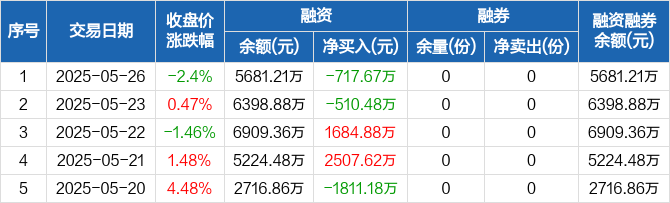 融资方面,当日融资买入4957.71万元,融资偿还5675.39万元,融资净偿还717.67万元。融券方面,融券卖出0份,融券偿还0份,融券余量0份,融券余额0元。融资融券余额合计5681.21万元。