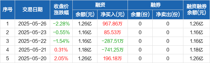 融资方面,当日融资买入4919.7万元,融资偿还3951.84万元,融资净买入967.86万元。融券方面,融券卖出0份,融券偿还0份,融券余量0份,融券余额0元。融资融券余额合计1.26亿元。