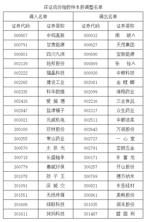 上证报中国证券网讯深交所6月3日公告,根据指数编制规则,深圳证券交易所和深圳证券信息有限公司决定于2025年6月16日对深证成指、创业板指、深证100等指数实施样本股定期调整。部分指数样本股调整名单见下表。
