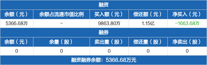 融资方面,当日融资买入9863.8万元,融资偿还1.15亿元,融资净偿还1663.68万元。融券方面,融券卖出0份,融券偿还0份,融券余量0份,融券余额0元。融资融券余额合计5366.68万元。