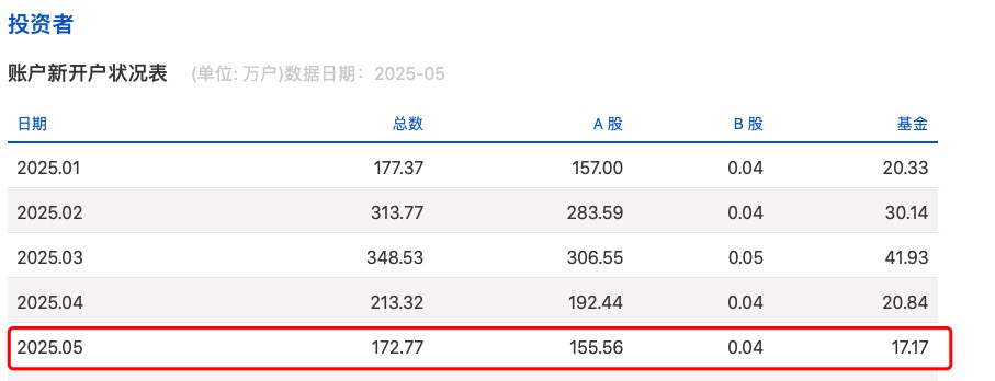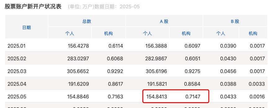 上交所官网最新数据显示,2025年5月,个人投资者新开A股账户达156万户,较4月的192万户有所下滑。其中,个人投资者新开户数达154.84万户,机构投资者新开户数为0.7147万户。