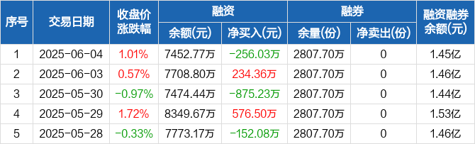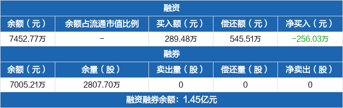 融资方面,当日融资买入289.48万元,融资偿还545.51万元,融资净偿还256.03万元。融券方面,融券卖出0份,融券偿还0份,融券余量2807.7万份,融券余额7005.21万元。融资融券余额合计1.45亿元。