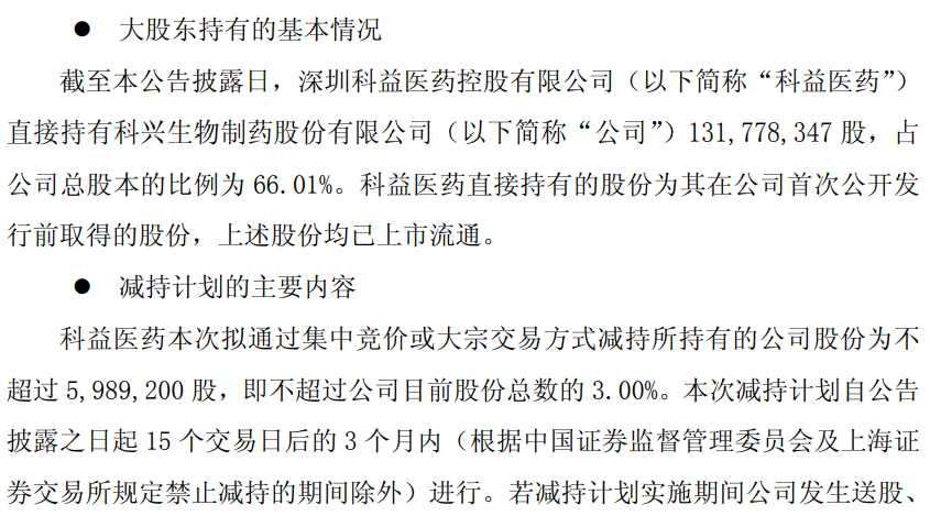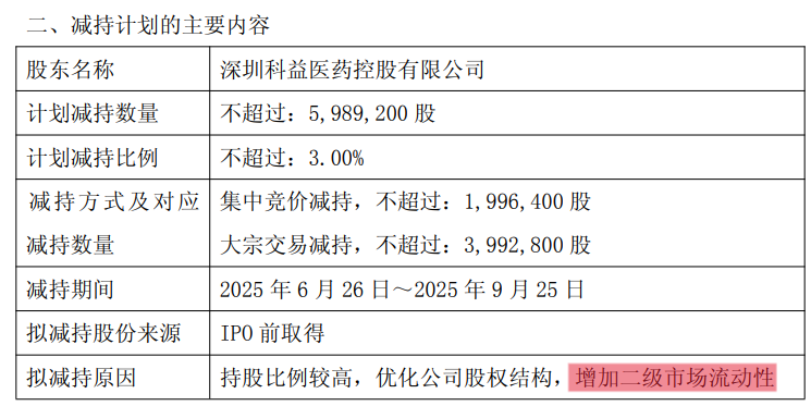 但值此创新药爆发之际,却有资本想减持了。科兴制药(688136)昨晚公告,公司控股股东深圳科益医药控股有限公司(简称“科益医药”)计划通过集中竞价或大宗交易方式减持不超过598.92万股,即不超过公司目前股份总数的3%。不过,让股民有点大跌眼镜的是,科益医药减持的理由之一,竟然是“为增加二级市场流动性”!
