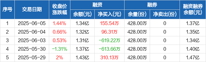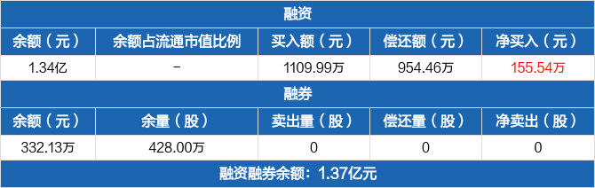 融资方面,当日融资买入1109.99万元,融资偿还954.46万元,融资净买入155.54万元。融券方面,融券卖出0份,融券偿还0份,融券余量428万份,融券余额332.13万元。融资融券余额合计1.37亿元。