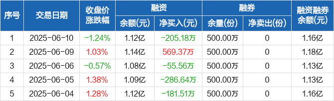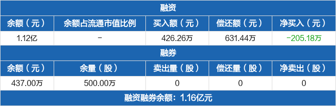 融资方面,当日融资买入426.26万元,融资偿还631.44万元,融资净偿还205.18万元。融券方面,融券卖出0份,融券偿还0份,融券余量500万份,融券余额437万元。融资融券余额合计1.16亿元。