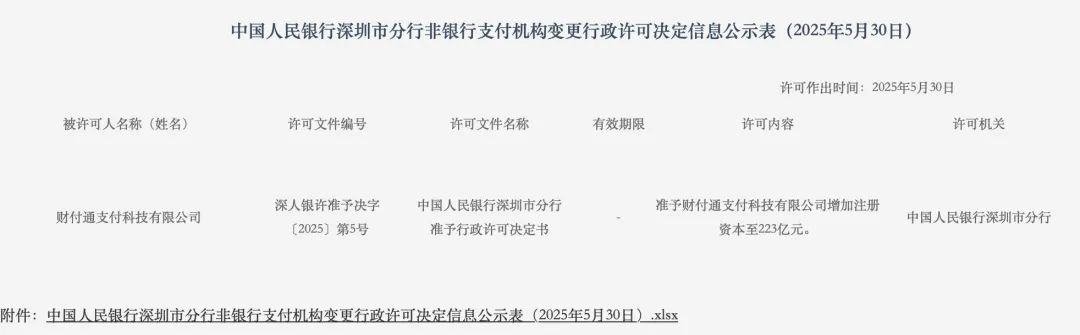6月10日,中国人民银行深圳市分行非银行支付机构变更行政许可决定信息公示显示,财付通支付科技有限公司(以下简称“财付通”)获批增资70亿元,注册资本从153亿元增至223亿元,增幅高达45.75%。