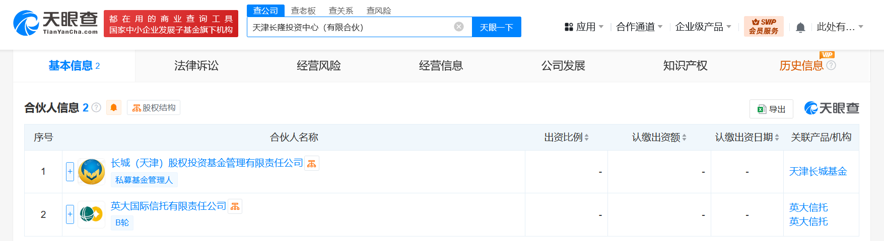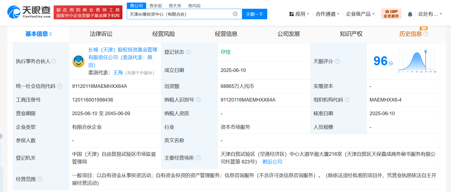 每经AI快讯,天眼查App显示,近日,天津长隆投资中心(有限合伙)成立,执行事务合伙人为长城(天津)股权投资基金管理有限责任公司,出资额约6.9亿元人民币,经营范围为以自有资金从事投资活动、自有资金投资的资产管理服务、信息咨询服务。合伙人信息显示,该投资中心由长城(天津)股权投资基金管理有限责任公司、英大国际信托有限责任公司共同出资。