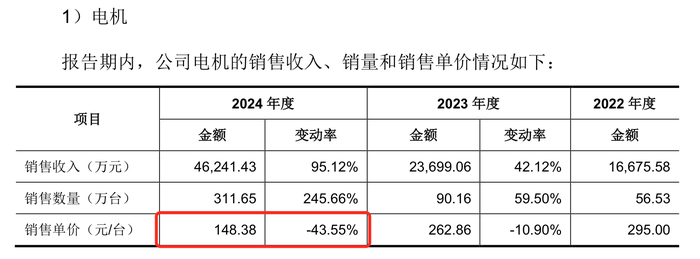 界面新闻留意到,三瑞智能无人机动力系统可分为无人机电机、电子调速器、螺旋桨和一体化动力系统,其中无人机电机比重最大,占总营业收入的55%。不过公司电机在报告期内收入大幅攀升的同时,单价却呈现走跌态势,2022年至2024年售价分别为295元/台、262元/台、148元/台,2024年销售单价的变动率为-43.55%。