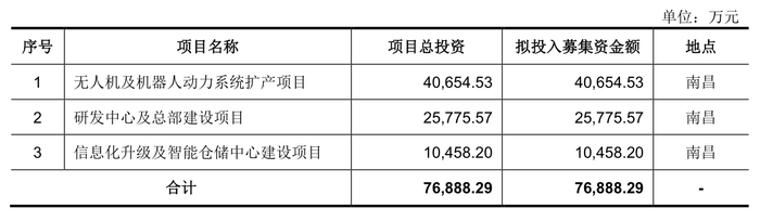 本次IPO,三瑞智能拟募资7.69亿元,用于无人机及机器人动力系统扩产项目、研发中心及总部建设项目和信息化升级及智能仓储中心建设项目。