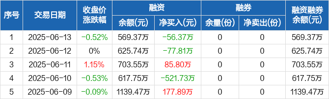 融资方面,当日融资买入106.43万元,融资偿还162.8万元,融资净偿还56.37万元。融券方面,融券卖出0份,融券偿还0份,融券余量0份,融券余额0元。融资融券余额合计569.37万元。