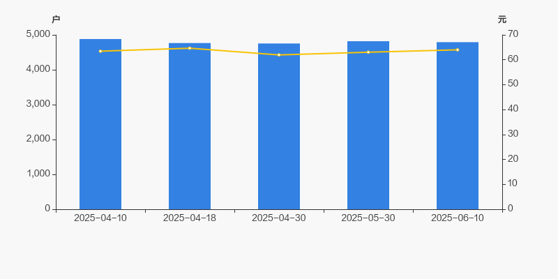 截至2025年6月10日,公司最新总股本为4550.01万股,其中流通股本为2179.22万股。户均持有流通股数量由上期的4640股下降至4549股,户均流通市值29.11万元。