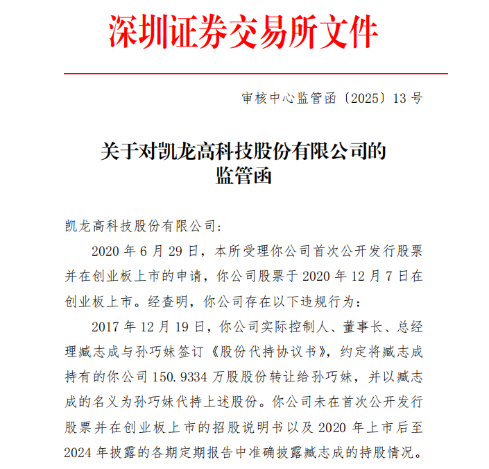 (原标题:中金保荐!凯龙高科因股权代持收监管函)