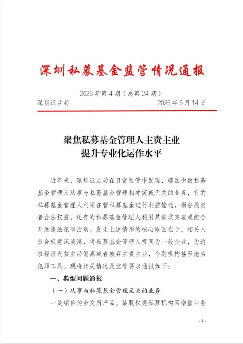 近日,深圳证监局发布最新一期《深圳私募基金监管情况通报》,剑指诸多私募乱象,比如部分私募开展销售伪金交所产品、卖课、算命、修家谱等与私募基金无关的业务,利用产品违规进行利益输送,甚至利用管理人资质从事违法犯罪活动,严重扰乱市场秩序。对此,深圳证监局表示,下一步将持续加强对辖区私募基金管理人合规运作的监管检查力度,严肃问责各类违法违规行为。