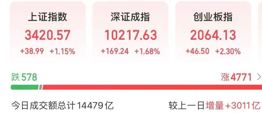 截至收盘,上证指数上涨1.15%,站上3400点,深证成指涨1.68%,创业板指涨2.30%,全市场超4700只个股上涨。全市场成交额14479亿元,较上日放量3011亿元。