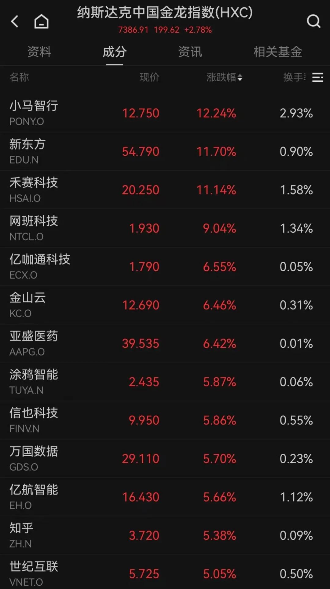 截至北京时间23:05,多只中概股大涨,纳斯达克中国金龙指数涨逾2.7%,小马智行涨超12%,新东方涨近12%。
