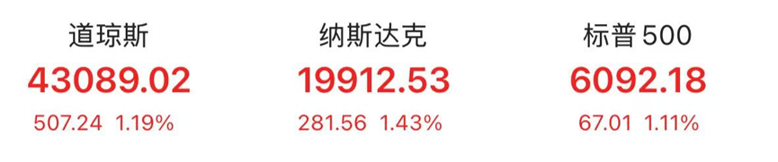 降息新信号叠加中东紧张局势透露缓和迹象,美股三大指数集体收涨,均涨超1%。截至收盘,道指涨507.24点,涨幅为1.19%,报43089.02点;纳指涨281.56点,涨幅为1.43%,报19912.53点;标普500指数涨67.01点,涨幅为1.11%,报6092.18点。