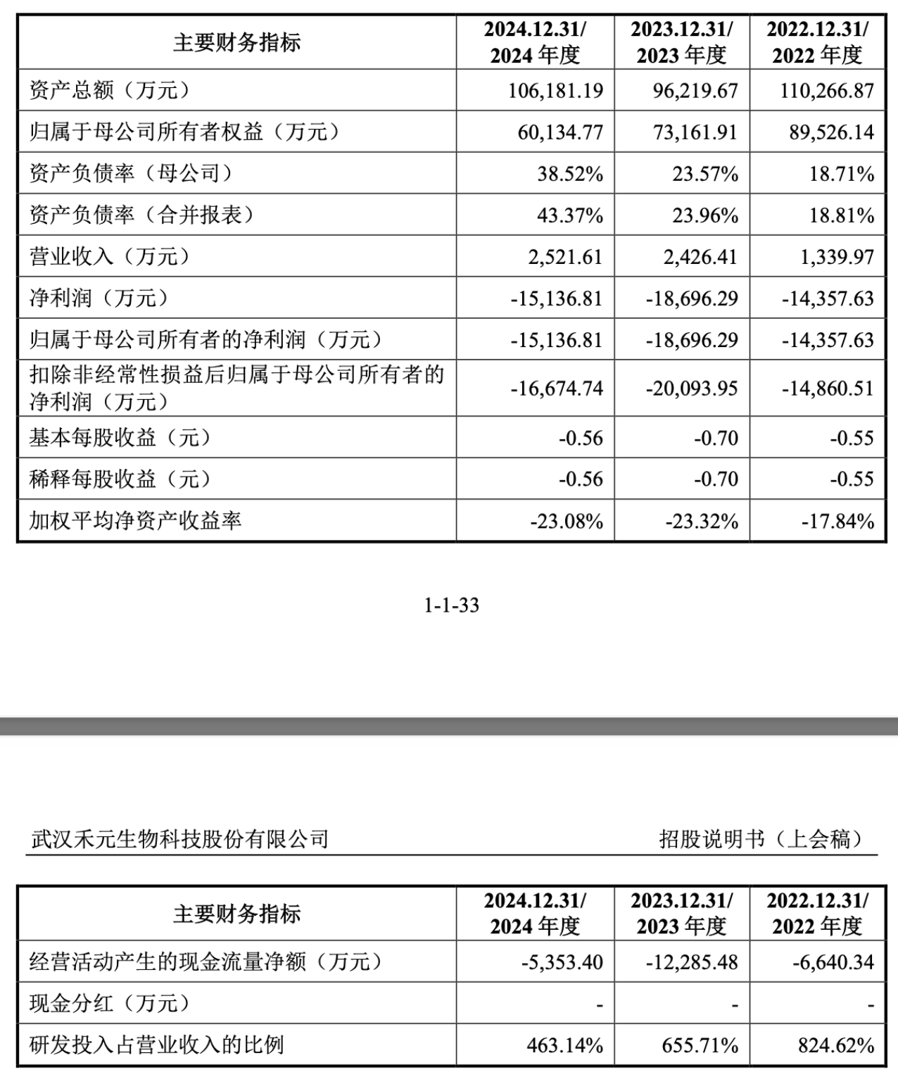 经营业绩方面,2022年度至2024年度,禾元生物实现营收1339.97万元、2426.41万元、2521.61万元,归母净利润-1.44亿元、-1.87亿元、-1.51亿元。