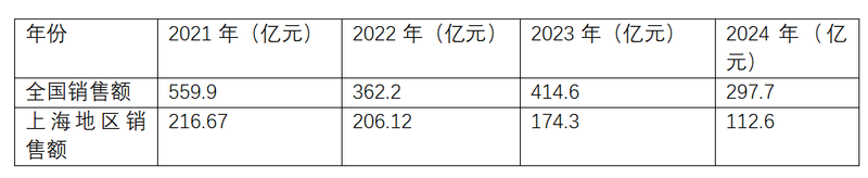 回顾过往4年,大华集团的销售额从2021年的559.9亿元下降到了去年的297.7亿元;上海地区的销售额也从216.67亿元下降到了112.6亿元。