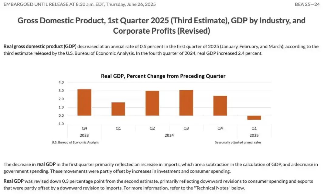 当地时间6月26日,美国商务部公布的最终修正数据显示,2025年第一季度美国国内生产总值(GDP)环比按年率计算萎缩0.5%,较此前公布的初次估值和修正值明显下调。