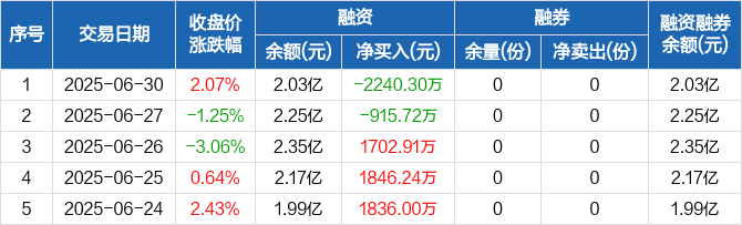 融资方面,当日融资买入1.08亿元,融资偿还1.3亿元,融资净偿还2240.3万元。融券方面,融券卖出0份,融券偿还0份,融券余量0份,融券余额0元。融资融券余额合计2.03亿元。