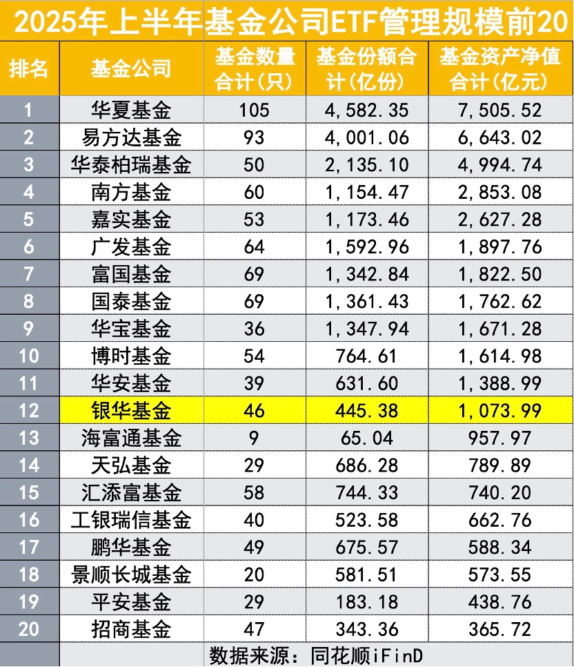 【12家超千亿ETF公募合计管理规模3.59万亿 前十排名出炉】ETF依然是少数头部“玩家”的战场,iFind数据显示,全市场55家资管机构发行ETF,合计管理规模4.3万亿。截至上半年,12家规模超千亿公募基金管理合计管理规模达3.59万亿,占所有ETF规模八成之多。