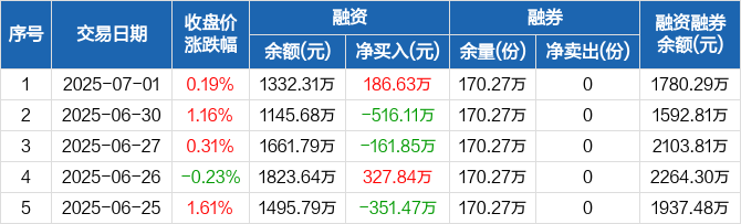 融资方面,当日融资买入329.1万元,融资偿还142.46万元,融资净买入186.63万元。融券方面,融券卖出0份,融券偿还0份,融券余量170.27万份,融券余额447.98万元。融资融券余额合计1780.29万元。