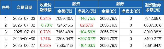 融资方面,当日融资买入241.14万元,融资偿还387.89万元,融资净偿还146.75万元。融券方面,融券卖出0份,融券偿还0份,融券余量2056.79万份,融券余额843.28万元。融资融券余额合计7942.69万元。