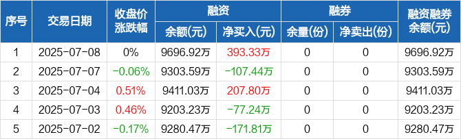 融资方面,当日融资买入4378.41万元,融资偿还3985.08万元,融资净买入393.33万元。融券方面,融券卖出0份,融券偿还0份,融券余量0份,融券余额0元。融资融券余额合计9696.92万元。