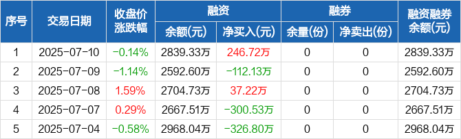 融资方面,当日融资买入1179.29万元,融资偿还932.57万元,融资净买入246.72万元。融券方面,融券卖出0份,融券偿还0份,融券余量0份,融券余额0元。融资融券余额合计2839.33万元。