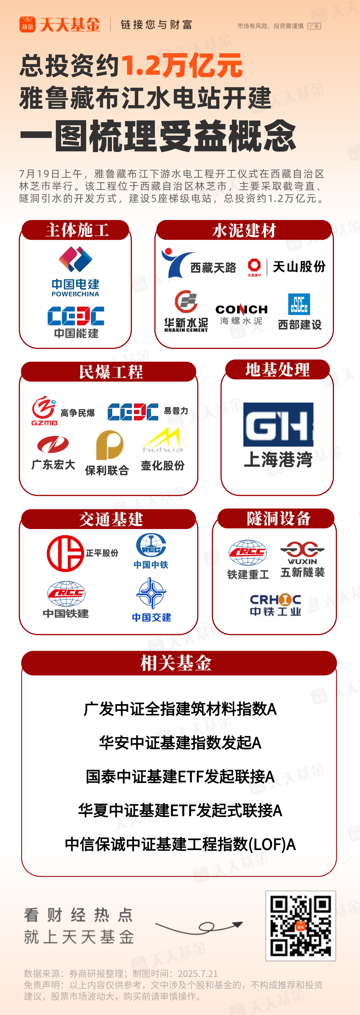天风证券分析认为,该工程土建工程投资规模庞大,中国电建、中国能建将成为核心受益企业。由于雅鲁藏布江下游地质环境复杂,地基处理难度极大,弹性标的中岩大地值得关注。在引水隧洞关键设备方面,重点推荐隧道掘进机设备生产商铁建重工、中铁工业等。爆破工程领域,建议重点关注高争民爆、易普力、广东宏大、保利联合和壶化股份。材料端则重点关注水泥板块的西藏天路、华新水泥,以及减水剂板块的苏博特。