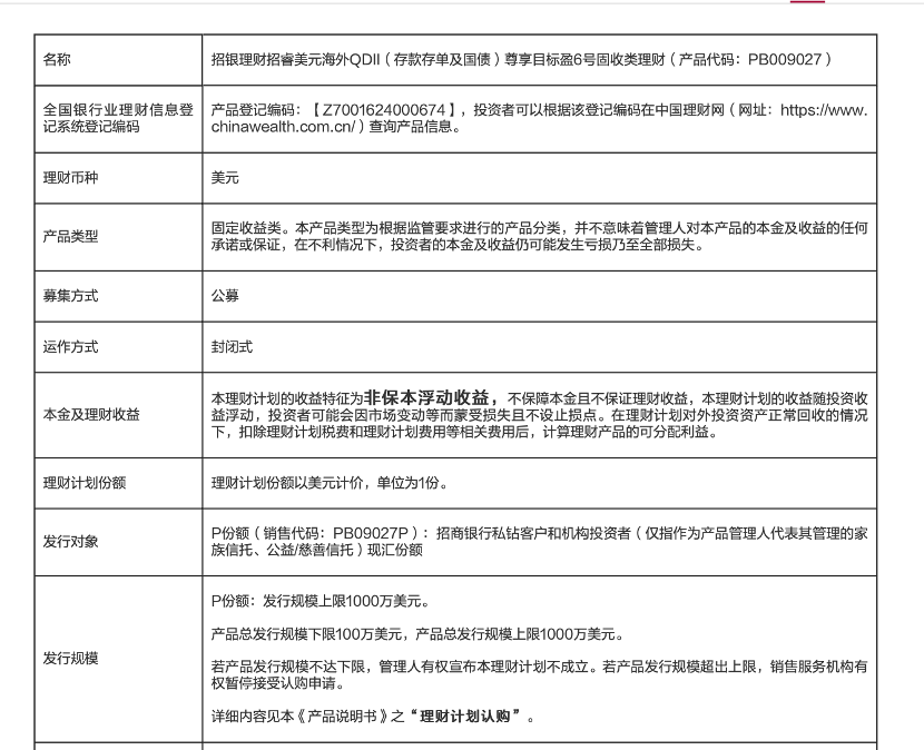 7月17日,招银理财发布公告显示,名为“招银理财招睿美元海外QDII(存款存单及国债)尊享目标盈6号固收类理财”的美元理财产品因达到止盈条件已提前终止。