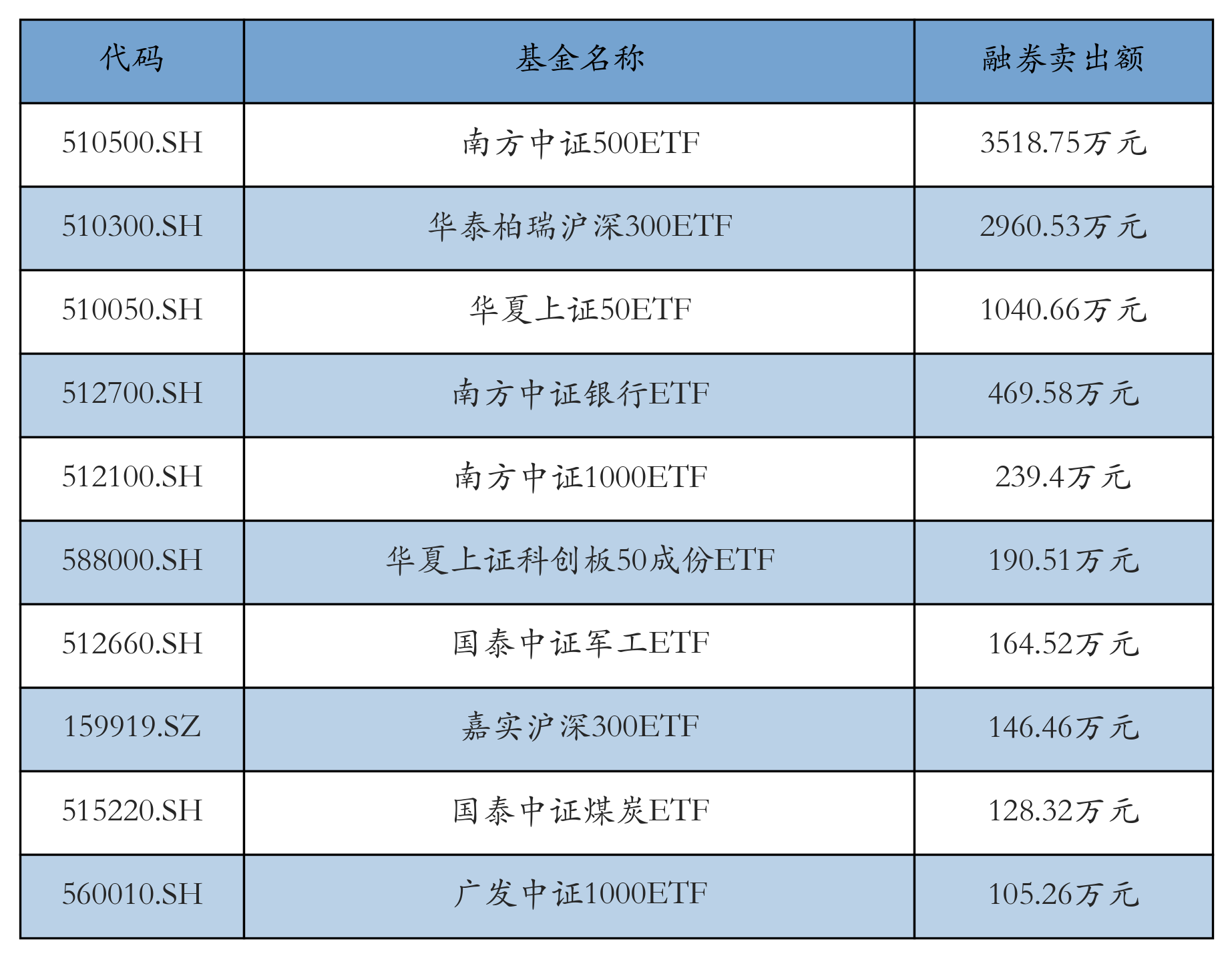 7月21日ETF融券卖出额前三位分别为:南方中证500ETF(3518.75万元)、华泰柏瑞沪深300ETF(2960.53万元)和华夏上证50ETF(1040.66万元),前10具体见下表: