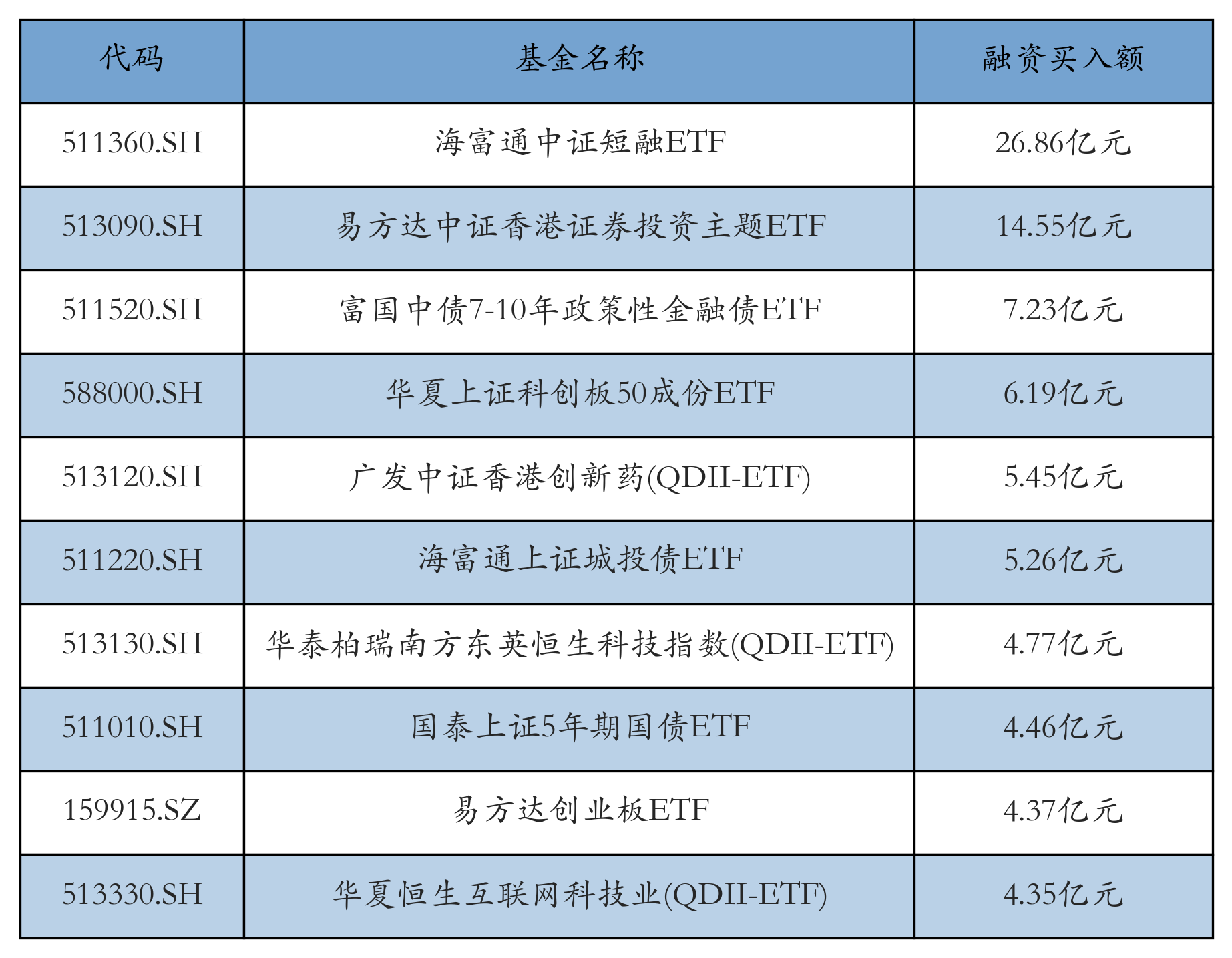 7月21日ETF融资买入额前三位分别为:海富通中证短融ETF(26.86亿元)、易方达中证香港证券投资主题ETF(14.55亿元)和富国中债7-10年政策性金融债ETF(7.23亿元),前10具体见下表: