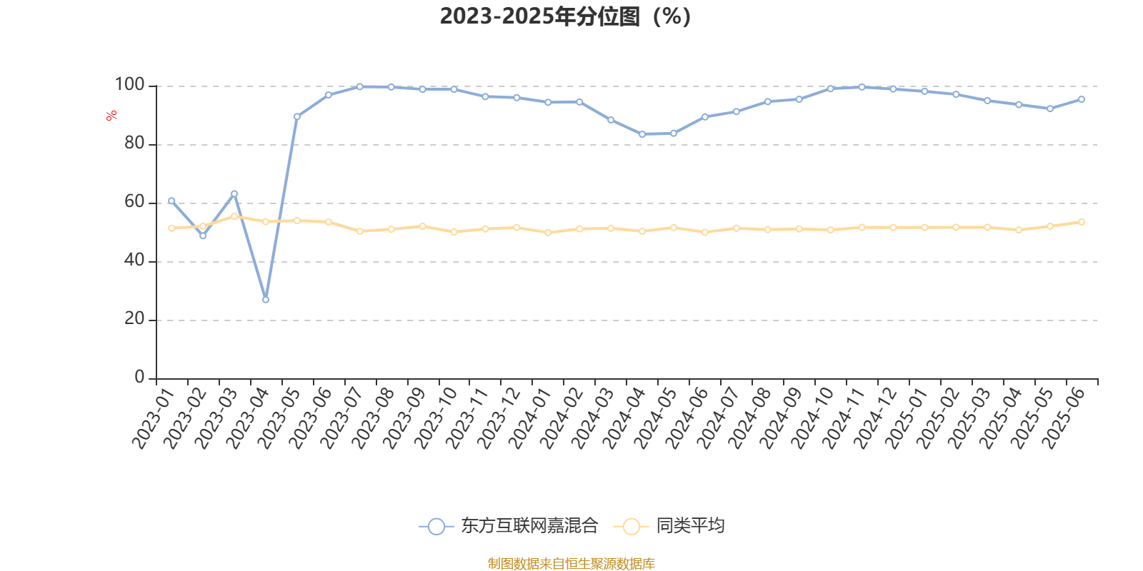 通过所选区间该基金净值增长率分位图,可以观察该基金与同类基金业绩比较情况。图为坐标原点到区间内某时点的净值增长率在同类基金中的分位数。