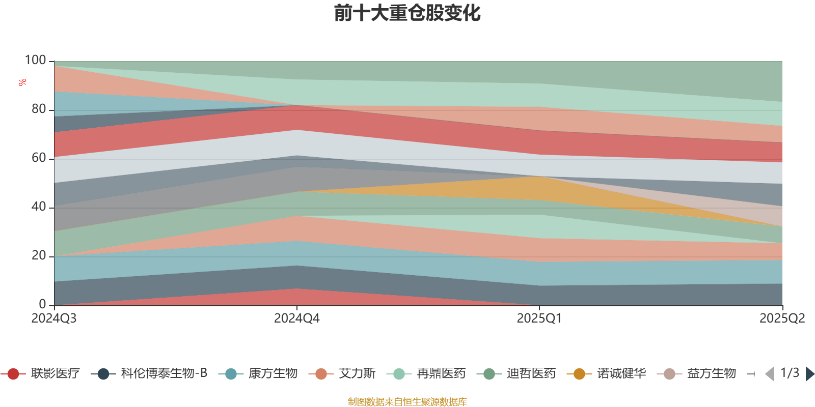 该基金持股集中度较高。截至2025年二季度末,基金十大重仓股分别是云顶新耀、康方生物、信达生物、科伦博泰生物-B、百利天恒、益方生物、百济神州、艾力斯、泽璟制药、迪哲医药。
