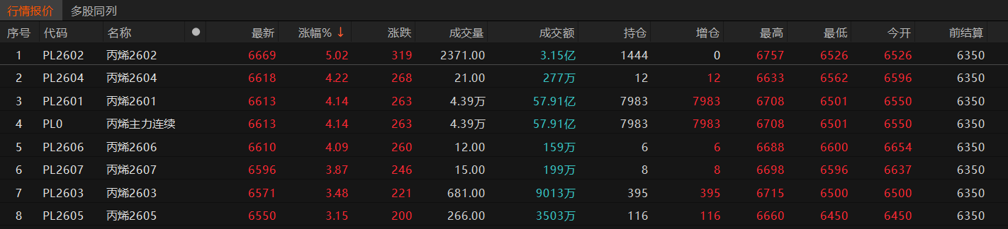 丙烯期货首日挂牌PL2601、PL2602、PL2603、PL2604、PL2605、PL2606、PL2607共七个合约,挂牌价为6350元/吨。从当日收盘价格看,丙烯期货上市的7个合约在交易首日全线收涨,涨幅在3%至5%左右。其中,主力合约PL2601收涨4.14%,涨幅最大的为PL2602,收涨5.02%。