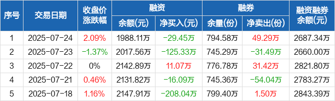融资方面,当日融资买入205.74万元,融资偿还235.19万元,融资净偿还29.45万元。融券方面,融券卖出50.81万份,融券偿还1.52万份,融券余量794.58万份,融券余额699.23万元。融资融券余额合计2687.34万元。