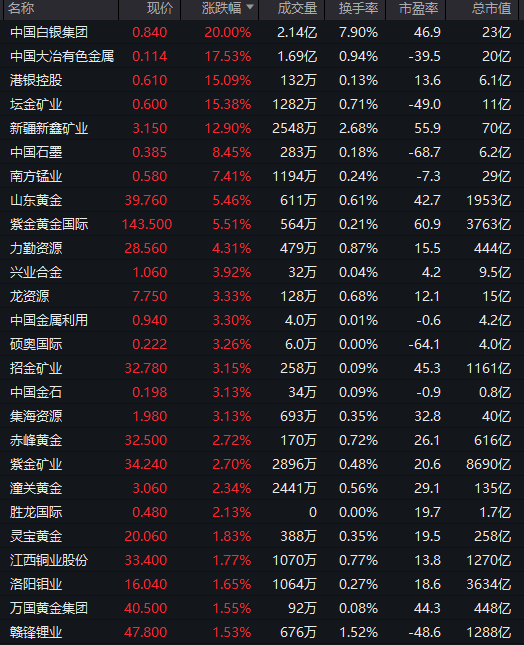 贵金属概念股持续走强,中国白银集团大涨20%,紫金黄金国际、山东黄金、招金矿业等跟涨。
